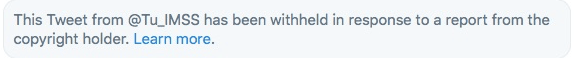 Sin embargo el jueves 24 de enero, la plataforma digital Twitter elimino las publicaciones de la cuenta oficial del IMSS «@Tu_IMSS» (en Twitter), debido a una violación de los derechos de autor.